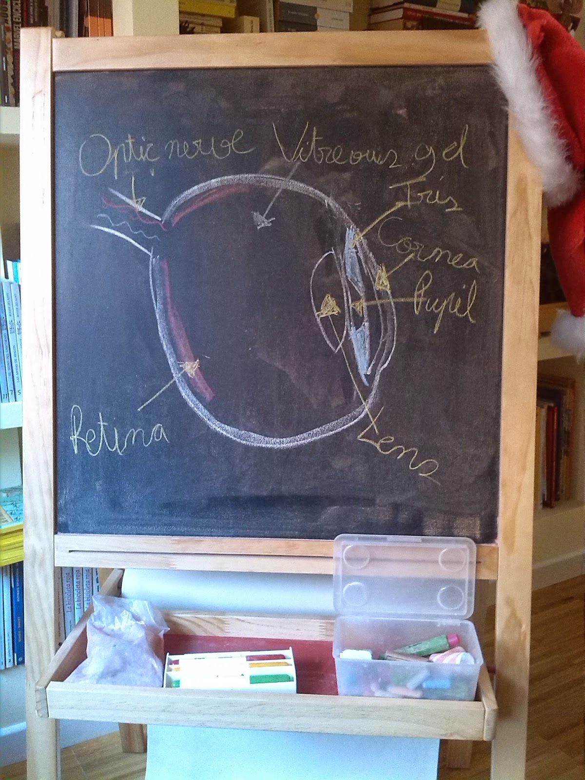 The eye is the organ of sight. The eye is composed of the following parts, as shown in these two pictures (guess which one I've made in my home blackboard)